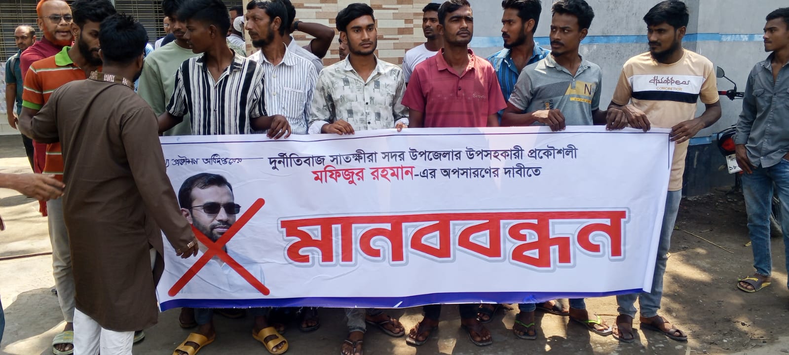 মানববন্ধনে উপস্থিত ছিলেন জেলা জাসাসের সভাপতি শেখ জিল্লুর রহমান, জেলা ওলামাদলনেতা মিজানুর রহমানসহ সাতক্ষীরার সকল স্তরের সচেতন জনগন। মানববন্ধনে বক্তারা বলেন, একাধিক ঠিকাদার বলেছেন ফান্ডের চিঠি করা থেকে শুরু করে টাইম এক্সটেনশন, কাজের রিভাইস কার্যাাদেশ প্রদান করা সহ সকল কাজের জন্য তাকে এক্সট্রা টাকা দিতে হয়। তার এহেন সকল কাজের পৃষ্ঠপোষকতায় নির্বাহী প্রকৌশলী মোহাম্মদ জাহিদ পারভেজ জ্ঞাতও আছেন বলে সে জানায়।  মফিজুর রহমান নিজে ঠিকাদারি ব্যবসার সাথে জড়িত। এমনকি জেলার সাব কন্ট্রাক্টরি  কাজ সে মিস্ত্রি সরদার আলমগীরকে দিয়ে করিয়ে আসছেন এবং প্রতি কাজ থেকে কমিশন বাগিয়ে নিচ্ছেন। বর্তমানে স্থানীয় ঠিকাদাদের সাথে বনি বনা কম হওয়ায় বাইরে থেকে সে ঠিকাদার নিয়ে আসতেছে এবং কাজ হাতিয়ে নিচ্ছে। এর সকল পৃষ্ঠপোষকতায় নির্বাহী প্রকৌশলী জাহিদ পারভেজ জড়িত। বক্তারা