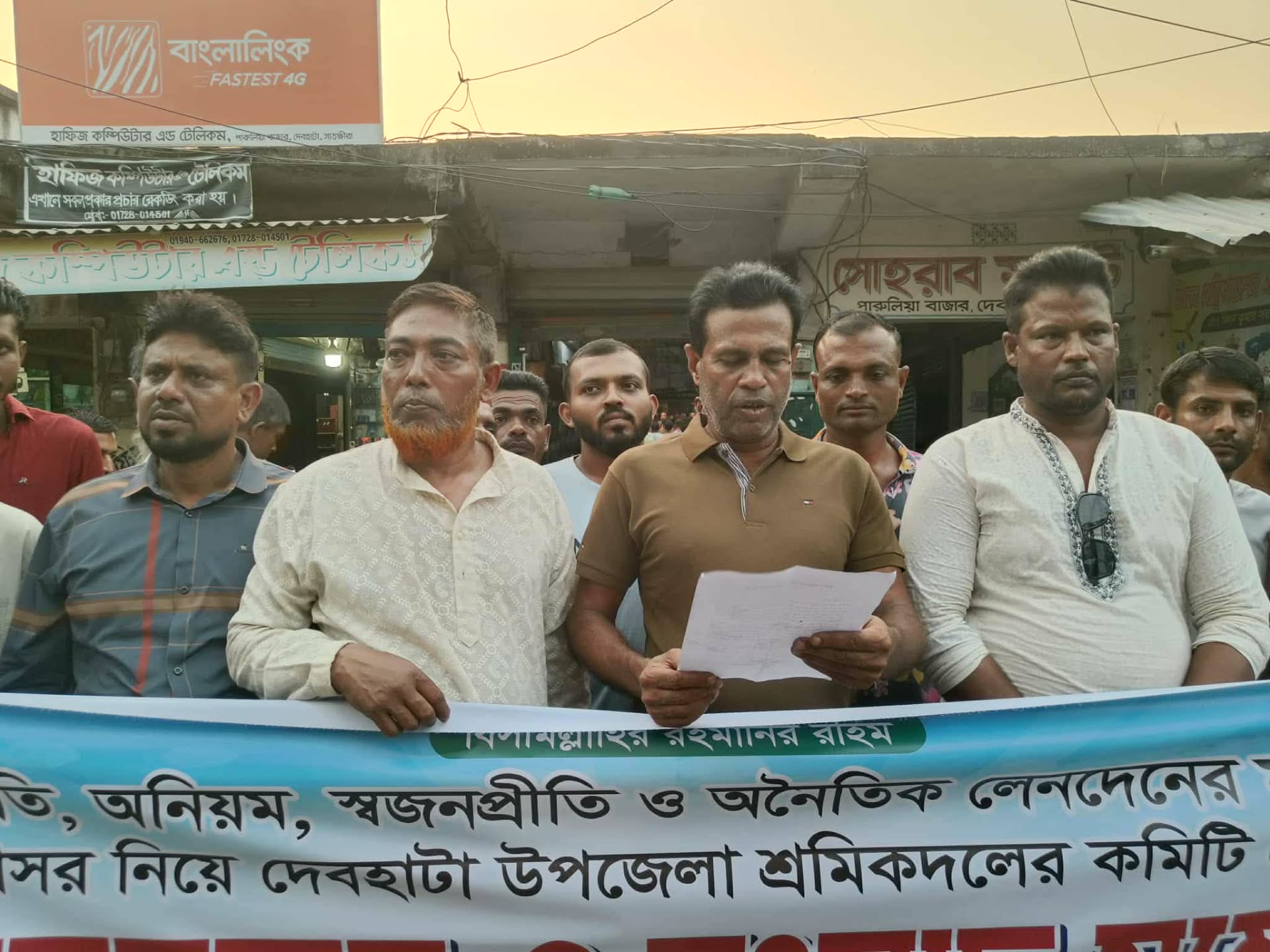 শ্রমিক দলের কমিটি গঠনের প্রতিবাদে মানববন্ধন ও সংবাদ সম্মেলন অনুষ্ঠিত হয়েছে। শনিবার( ২৫ অক্টোবর) বিকালে দেবহাটার পারুলিয়া বাসস্ট্যান্ডে জাতীয়তাবাদী শ্রমিকদল দেবহাটা উপজেলা শাখার সাবেক নেতৃবৃন্দের আয়োজনে সংবাদ সম্মেলনে বক্তব্য রাখেন, দেবহাটা উপজেলা শ্রমিকদলের সাবেক সভাপতি বিকাশ কুমার সরকার, দেবহাটা শ্রমিকদলের সাবেক সহ সভাপতি আবু জাফর, আনারুল ইসলাম, সাধারণ সম্পাদক আসাদুল ইসলাম, দেবহাটা শ্রমিকদলের সাবেক সহ সভাপতি আ: আলিম, দেবহাটা শ্রমিকদলের সাবেক সহ সভাপতি আনারুল ইসলাম। এসময় উপস্থিত শ্রমিকদলের ইউনিয়ন সভাপতি অহিদুল ইসলাম, কুলিয়া ইউনিয়ন শ্রমিকদলের লিটন, সাধারণ সম্পাদক আজিজুল ইসলাম, পারুলিয়া ইউনিয়ন শ্রমিকদলের সাধারণ সম্পাদক তানভীর কবির সুজা, সখিপুর ইউনিয়ন শ্রমিকদলের সহ সম্পাদক হামিদুল ইসলাম, দেবহাটা ইউনিয়ন শ্রমিক দল নেতা কবির হোসেন প্রমুখ।