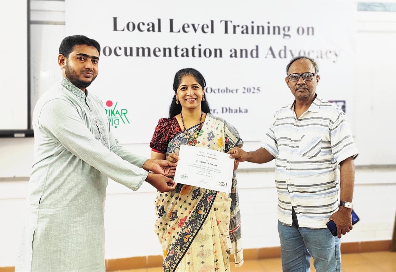 নিজস্ব প্রতিনিধি: আন্তর্জাতিক মানবাধিকার ফেডারেশন (FIDH)-এর সদস্য বাংলাদেশের মানবাধিকার সংস্থা (অধিকারের) উদ্যোগে ১৯ অক্টোবর (রবিবার) ঢাকায় ৩ দিনব্যাপী মানবাধিকার বিষয়ক প্রশিক্ষণ কর্মশালা শেষে সাংবাদিক মুজাহিদুল ইসলামকে মানবাধিকারের সনদ প্রদান করা হয়। এ সময় সনদ প্রদান করেন (অধিকার) মানবাধিকার সংস্থার পরিচালক তাসকিন ফাহমিনা, পরিচালক এ এস এম নাসির উদ্দিন এলান। আরো উপস্থিত ছিলেন (অধিকার) মানবাধিকার সংস্থার সাধারণ সম্পাদক ডা. সাইরা রহমান খান । এ সময় সাংবাদিক মুজাহিদুল ইসলামকে (অধিকার) মানবাধিকার সংস্থার সাতক্ষীরা জেলার কো-অর্ডিনেটরের দায়িত্ব দেওয়া হয়।