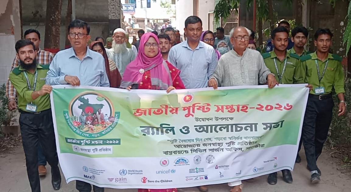 “পুষ্টি বৈষম্যের দিন শেষ, গড়ব স্বনির্ভর বাংলাদেশ” এই প্রতিপাদ্যকে সামনে রেখে সাতক্ষীরায় জাতীয় পুষ্টি সপ্তাহ ২০২৬ উদ্বোধন উপলক্ষে বর্ণাঢ্য র‍্যালি ও আলোচনা সভা অনুষ্ঠিত হয়েছে। বৃহস্পতিবার (২৩ এপ্রিল)  বেলা সাড়ে ১২ টায় সাতক্ষীরা সিভিল সার্জন কার্যালয়ের সামনে হতে জনস্বাস্থ্য পুষ্টি প্রতিষ্ঠান এর আয়োজনে এবং সিভিল সার্জন অফিস সাতক্ষীরার বাস্তবায়নে এক র‍্যালি বের হয়ে প্রধান প্রধান সড়ক প্রদক্ষিণ করে সিভিল সার্জন কার্যালয়ের কনফারেন্স রুমে আলোচনা সভায় মিলিত।  সাতক্ষীরা জেলা সিভিল সার্জন ডাঃ আব্দুস সালাম এর সভাপতিত্বে আলোচনা সভায় প্রধান অতিথির বক্তব্য রাখেন ও  জাতীয় পুষ্টি সপ্তাহ ২০২৬ এর  উদ্বোধন করেন  সাতক্ষীরা জেলা প্রশাসক মিজ আফরোজা আখতার। অনুষ্ঠানে বিশেষ অতিথি হিসেবে বক্তব্য রাখেন,  অতিরিক্ত পুলিশ সুপার,  মিথুন সরকার।