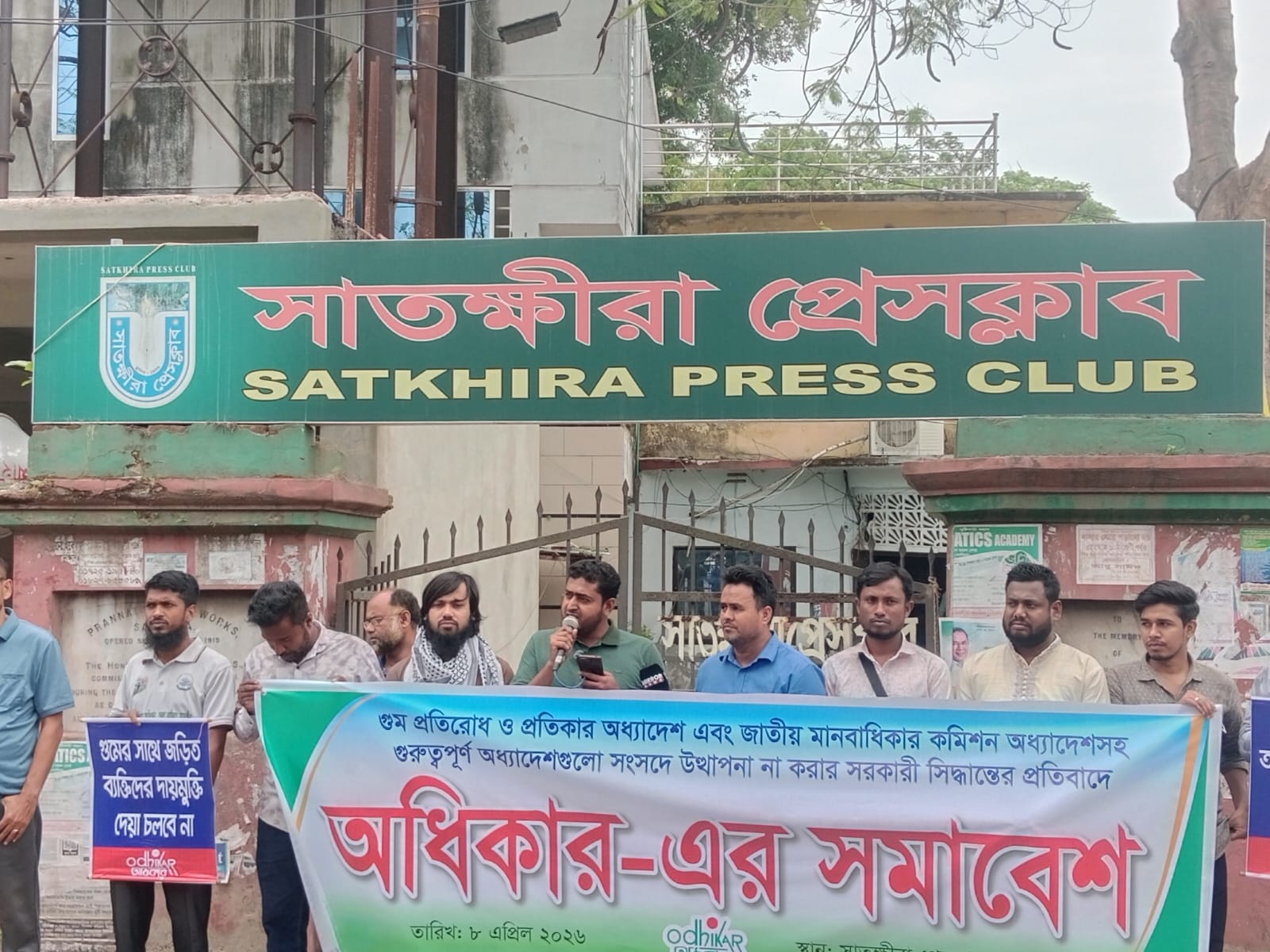 বক্তব্য রাখেন, দৈনিক আলোর পরশ পত্রিকার ব্যবস্থাপনা সম্পাদক ও দৈনিক সংগ্রাম পত্রিকার সাতক্ষীরা প্রতিনিধি আবু সাঈদ বিশ্বাস, বৈষম্য বিরোধী ছাত্র আন্দোলনের জেলা সমন্বয়ক আরাফাত হোসেন, সাংবাদিক কামরুল ইসলাম,  সাংবাদিক শাহজাহান আলী মিটন, মানবাধিকার কর্মী হাফিজুর রহমান প্রমুখ। এসময় বক্তারা বলেন, বিগত সরকারের সময় যেভাবে গুম, খুন হয়েছিলো তাতে মানবাধিকার কমিশন কোন প্রতিবাদ না করেই নিরব ছিলেন। এমন ঘটনা যাহাতে আর না ঘটে  সেই জন্য  গুম প্রতিরোধ ও প্রতিকার অধ্যাদেশ এবং জাতীয় মানবাধিকার কমিশন অধ্যাদেশসহ গুরুত্বপূর্ণ ১৬ টি অধ্যাদেশ জারি করেছিলো ইনটেরিম সরকার। অথচ বর্তমান নির্বাচিত সরকার সেই অধ্যাদেশগুলো আইনী ভিত্তি না দিয়ে বাতিলের সুপারিশ করেছে বিশেষ কমিটি। যা পূর্বের সরকারের ন্যায় ঠুনকো মার্কা কমিশনসহ অন্যান্য আইন বলবৎ থাকবে। বক্তারা আরো বলেন, বিচার বিভাগের স্বাধীনতা নিশ্চিত করার লক্ষ্যে সুপ্রিম কোর্টে বিচারক নিয়োগের জন্য সুপ্রিম কোর্টের বিচারক নিয়োগ অধ্যাদেশ ও স্বতন্ত্র সচিবালয় প্রতিষ্ঠার জন্য সুপ্রিম কোর্ট সচিবালয় অধ্যাদেশ ২০২৫ এবং সুপ্রিম কোর্ট সচিবালয় (সংশোধন) অধ্যাদেশ, ২০২৬, জাতীয় সংসদ সচিবালয় (অন্তবর্তীকালীন বিশেষ বিধান) অধ্যাদেশ এই চারটি অধ্যাদেশ বাতিল করতে জাতীয় সংসদের বিশেষ কমিটি জাতীয় সংসদে  বিল আনার সুপরিশ করেছে।  এমন আত্মঘাতী সিদ্ধান্ত থেকে সরকারকে সরে আসতে হবে। একটি বিপ্লবের মধ্য দিয়ে এই সরকারের মাধ্যমে দেশে গণতন্ত্রিক যাত্রা শুরু করেছে। সেই বিপ্লবের প্রতি সম্মান দেখিয়েগুরুত্বপূর্ণ অধ্যাদেশ বাতিলের প্রক্রিয়া বন্ধ করে অবিলম্বে আইনে পরিণত  করার জোর দাবী জানান বক্তারা।